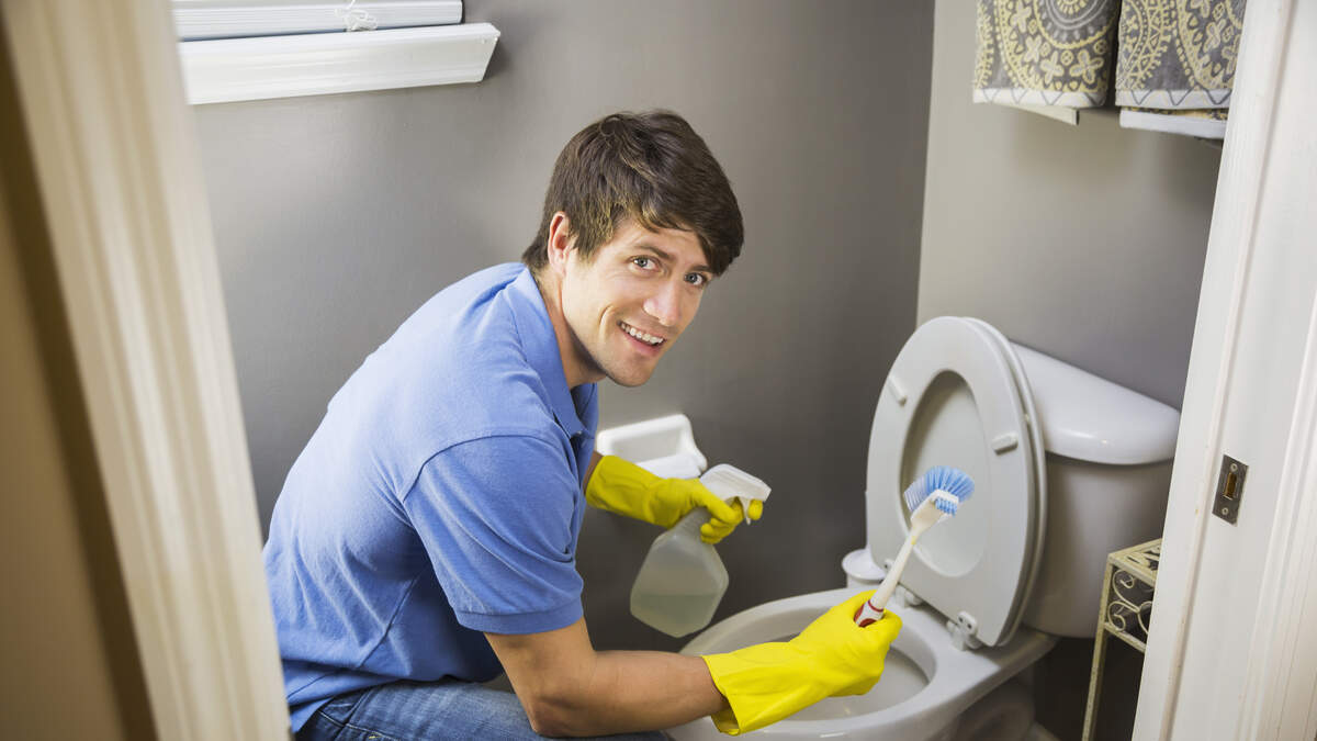 Man doing housework, cleaning bathroom toilet